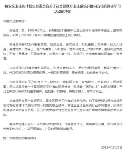 裕安区卫计委一则《关于在全区医疗卫生系统开展向方培虎同志学习活动的决定》引发热议。图片来源:人民日报客户端