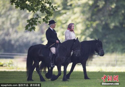 资料图:英国伊丽莎白女王与菲利普亲王在温莎城堡内骑马散步。图片来源:Sipachina版权作品请勿转载