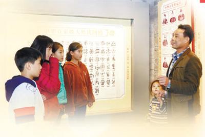 2月12日,海口市美富村村民王传代(右)给村里的孩子们讲述百家姓起源。本报记者黄晓慧摄