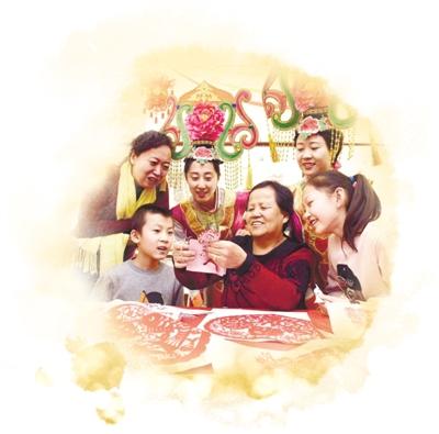 2月2日,呼和浩特满族文化博物馆,民间艺人项灵芝(右三)为游客传授满族民间剪纸技艺。王正摄