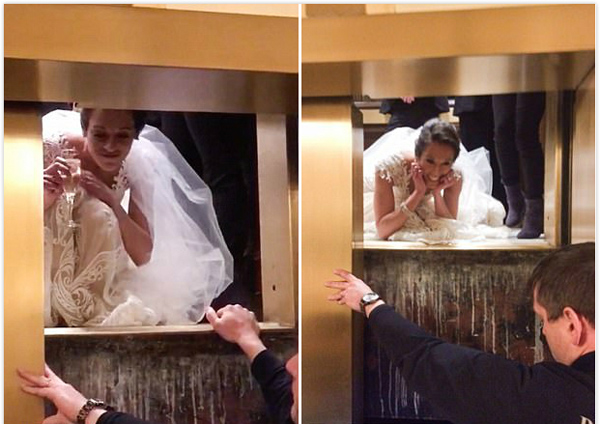 据英国《每日邮报》2月22日报道,近日,美国一位32岁的新娘梅丽莎•罗杰(MelissaRodger)在酒店乘电梯赶往婚礼现场时,电梯突发故障,将她困在其中长达1小时。消防队营救期间,婚礼来宾们一直想办法逗梅丽莎开心,还从打开的电梯门处递给她一杯香槟。最终新娘成功获救,婚礼按时举行。