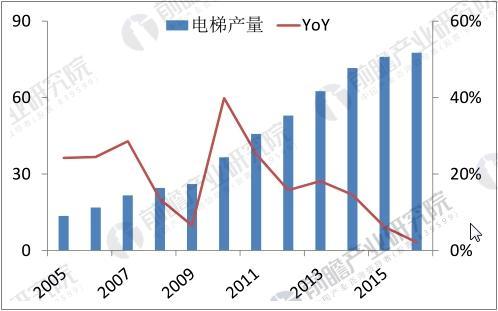 据前瞻产业研究院发布的《电梯行业市场需求预测与投资机会分析报告》数据显示,我国电梯产量从2002年的6.32万台快速增长至2016年的77.6万台,年复合增长率高达19.6%。截至2016年末,中国电梯的保有量已经达到493.69万台,居全第球第1位。