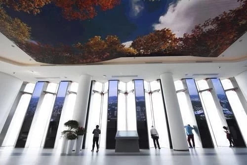 观光层大厅屋顶和立柱由LED屏幕覆盖金羊网记者王磊摄