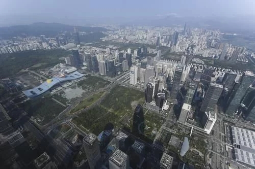 观光层东望深圳景色,市民中心、深南大道、莲花山、京基100、地王大厦、深圳河、清晰可见。金羊网记者王磊摄