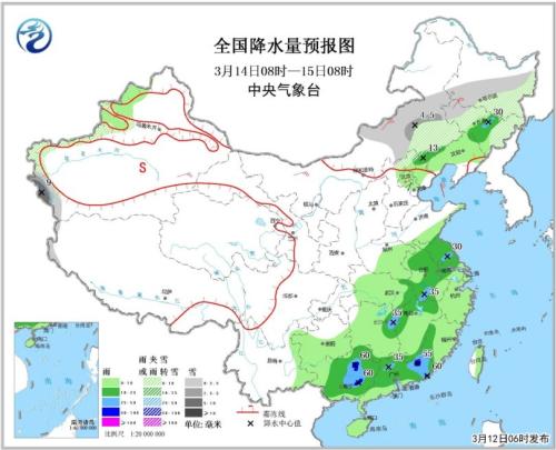 3月14日08时至15日08时,内蒙古中部和东部偏南地区、华北北部、东北地区中部和东部、新疆西部山区等地的部分地区有小到中雪或雨夹雪,局地大雪;江淮、江汉东部、江南北部和南部、华南、吉林中部等地的部分地区有中到大雨,其中广西中部、广东东部局地有暴雨。南疆盆地东部、内蒙古大部、华北北部、东北地区西部等地有4~6级风,南疆盆地局地有扬沙或浮尘天气;渤海有6~8级东北风,阵风9级。