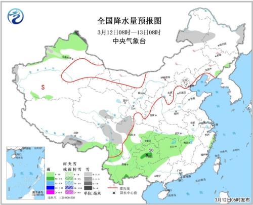 全国降水量预报图(3月12日08时-13日08时)