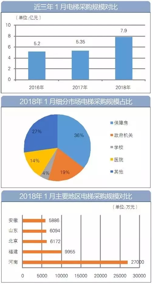 进入2018年,电梯采购迎来强势开局。据《政府采购信息报》不完全统计,1月,全国电梯采购规模突破7亿元大关,达7.9亿元,中标项目数量约356个。与2017年1月相比,电梯采购规模增加2.55亿元,项目数量增加81个,采购金额大,项目数量多,是1月电梯采购规模直线上升的直接原因。