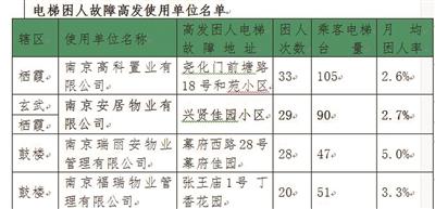 当天还公布了电梯困人故障高发使用单位名单,包括南京高科置业有限公司、南京安居物业有限公司、南京瑞丽安物业管理有限公司、南京福瑞物业管理有限公司。