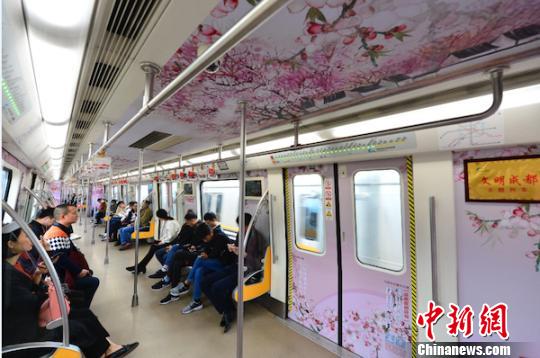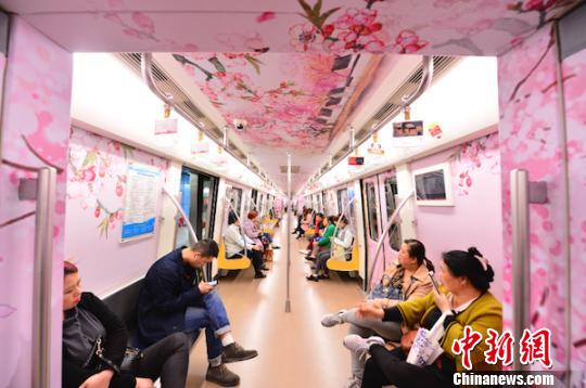 中新网成都3月19日电(邹立杨)为凸显成都龙泉驿区桃花文化,倡导广大市民绿色出行,营造成都春天气息,第一辆“开往春天的列车”——成都地铁2号线桃花专列于3月19日上午9点正式发车。