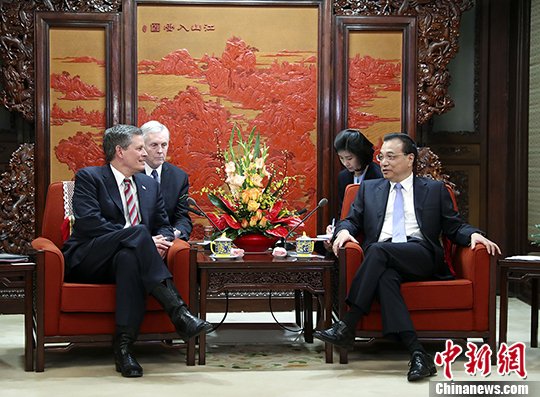 3月27日下午,中国国务院总理李克强在北京中南海紫光阁会见美国联邦参议员戴恩斯率领的议员访华团。中新社记者刘震摄