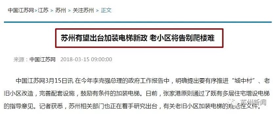 记者获悉,苏州相关部门也正在着手研究出台,有关老旧小区加装电梯的规范性文件。(苏州新闻)