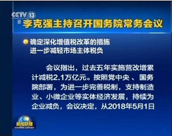 国务院总理3月28日主持召开国务院常务会议,确定深化增值税改革的措施,进一步减轻市场主体税负。会议指出,过去五年通过实施营改增累计减税2.1万亿元。按照党中央、国务院部署,为进一步完善税制,支持制造业、小微企业等实体经济发展,持续为市场主体减负,会议决定,从2018年5月1日起: