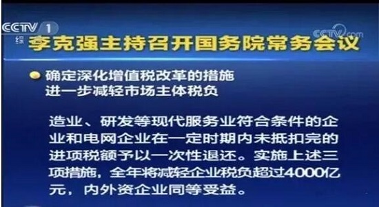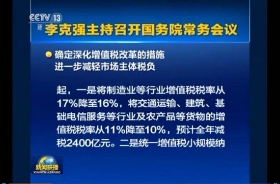 一是将制造业等行业增值税税率从17%降至16%,将交通运输、建筑、基础电信服务等行业及农产品等货物的增值税税率从11%降至10%,预计全年可减税2400亿元。