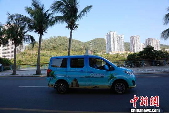 一辆微公交车行驶在三亚的街道上。王晓斌摄