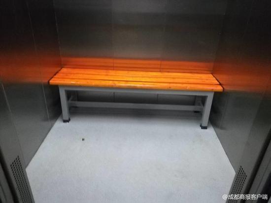 4月4日,记者来到位于尚华路108号的时代睿城小区,现场看到,每个电梯里面都安装了板凳,通过某种胶被固定了。这个板凳长约一米多,与电梯空间齐平,高约四十多厘米,宽约30厘米,大概占电梯四分之一的空间。
