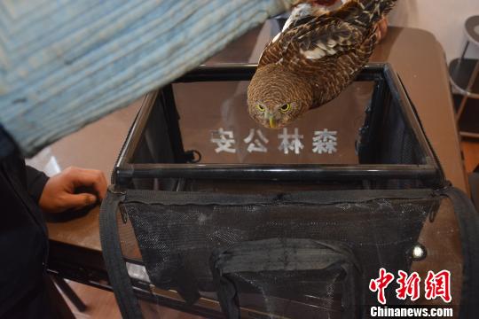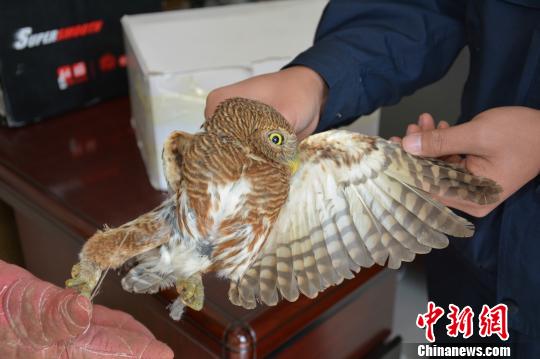 图为民警救助“迷路”的斑头鸺鹠黑萍英摄