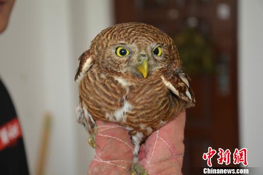 中新网红河4月11日电(郭鑫黑萍英赵志平)记者11日从云南省红河州森林公安局获悉,其民警在红河州金平县一居民家中发现一只“黄眼萌鹰”,经鉴定是国家二级重点保护野生动物斑头鸺鹠,其生命体征良好,无外伤痕迹,民警随即将其放生。