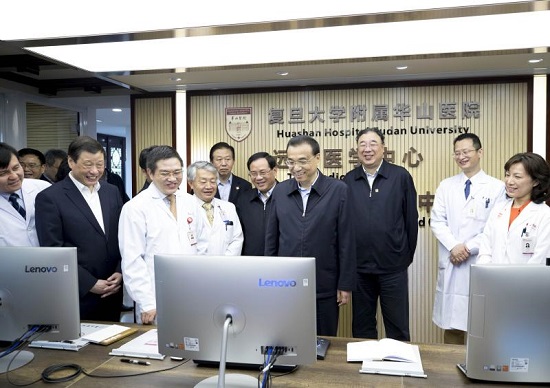 李克强来到华山医院,通过互联网远程会诊系统与青海果洛、云南腾冲、新疆喀什的医务人员对话,询问还有什么困难。他说,中西部地区尤其是农村贫困地区优质医疗资源缺乏,要按照以人民为中心的发展思想的要求,在继续改善中西部地区中心医院检测设施的同时,积极发展“互联网+医疗”,电信部门要为此通专线、提网速,医卫部门要更大发掘优质医疗资源的潜能,让好医生在中西部基层也能“触屏可及”。李克强还来到徐汇区江南新村,对这里实行社区医养结合,帮助老人们居家养老表示赞许。