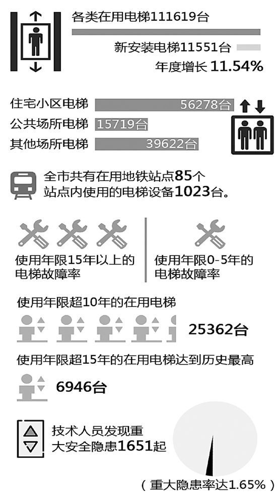 去年,全市检验机构共完成电梯定期检验98184台。在这些检验中,技术人员发现重大安全隐患1651起(重大隐患率达1.65%)。他说,如果这些安全隐患被忽略,后果可能会非常严重。