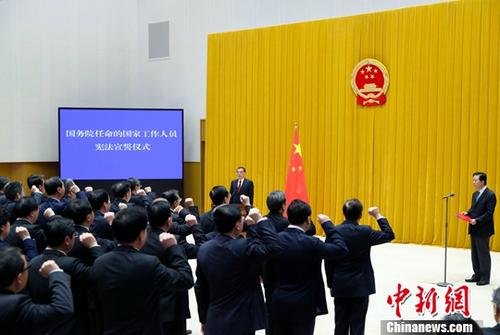 4月16日,新一届国务院在中南海举行宪法宣誓仪式。国务院总理李克强监誓。中新社记者刘震摄