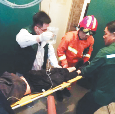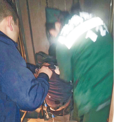 护士和电梯维保公司工作人员一起抬出伤者。市民供图