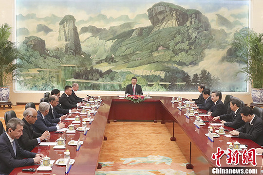 5月22日,中国国家主席习近平在北京人民大会堂集体会见来华出席上海合作组织成员国安全会议秘书第十三次会议的外方代表团团长。中新社记者盛佳鹏摄
