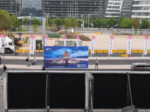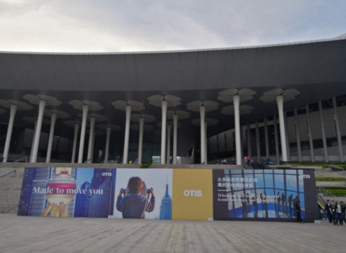 入口处,1853年创立于美国的电梯业龙头品牌-OTIS(奥的斯)的巨幅广告牌醒目矗立。它的对面——那片更加开阔的空地上,屹立着苏州莱茵电梯股份有限公司同样巨大的广告牌。