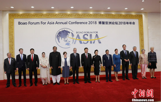 资料图:2018年4月10日,中国国家主席习近平在海南博鳌出席博鳌亚洲论坛2018年年会开幕式并发表主旨演讲。开幕式前,习近平和夫人彭丽媛前往迎宾厅迎接外方领导人夫妇并集体合影。中新社记者杜洋摄