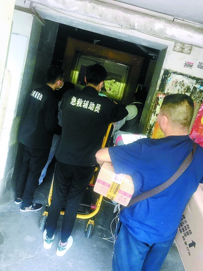 电梯门打开,下一个难题来了,电梯里除了开电梯的工作人员,还有桌椅,空间很小,一部标有准乘18人的电梯,根据实际体重能承载8个人已到了极限。无论是体积还是重量,担架车都上不去。把电梯里的椅子挪出来,担架车这才勉强进去。
