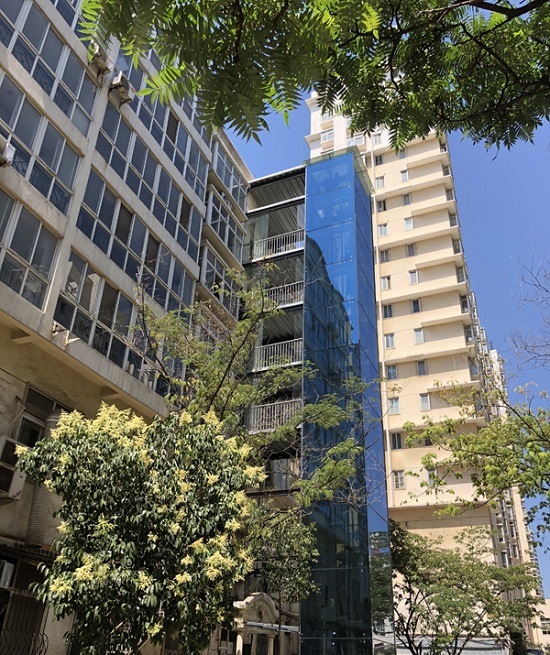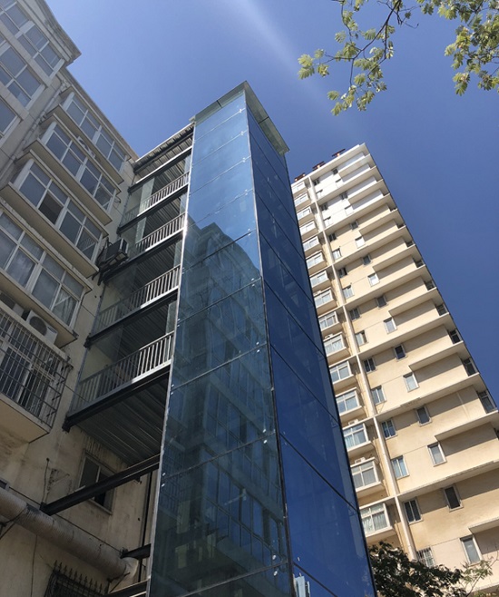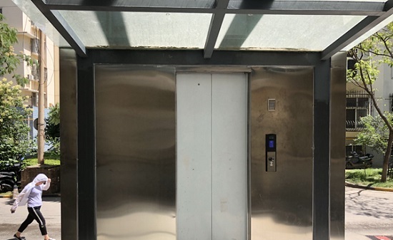 记者在现场看到,这部20多米高的电梯位于小区东北角的17号楼1单元楼房外,深蓝色的玻璃外观十分亮眼,据电梯内部数据显示,可载重800公斤,容纳10人同时乘坐。