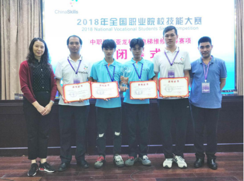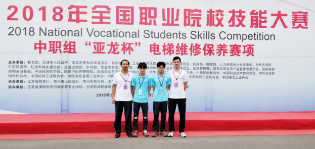 大洋网讯2018年全国职业院校技能大赛(中职组)“亚龙杯”电梯维修保养赛项于2018年6月1-3日在江苏省溧阳市天目湖中等专业学校举行,广州市轻工职业学校由校长胡学兰、智能控制教学部副部长叶俊杰带队,参赛学生吴文忠、吴锦锋(指导教师:岑伟富、许轩彦)以一流的竞技状态赛出广州市轻工职业学校学子的真我风采,以全国第二的历史好成绩,摘得电梯维修保养项目的金牌。这也是2018年国赛轻校获得的第二枚金牌,为学校60周年甲子庆再献一金。