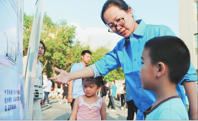 电梯安全讲解员指导儿童如何安全乘梯。本报记者郭俊峰摄