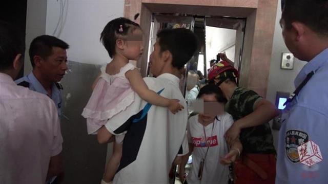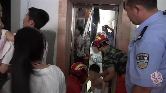 当地消防队和派出所接到报警后立即赶往现场,发现该商场一共三层,电梯停在一楼“无法动弹”,被困人员情绪激动,不时听见电梯内发出敲击声和儿童的哭喊声,派出所民警和物业管理员在现场处置了10多分钟,电梯厢门仅打开一条不足10公分的小缝。