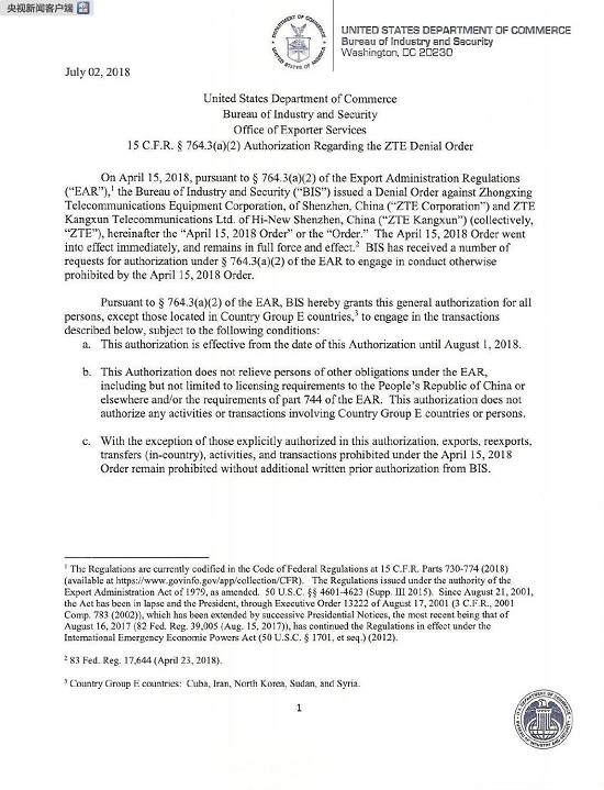 美国东部时间7月2日,美国商务部发布公告,暂时、部分解除对中兴通讯公司的出口禁售令。