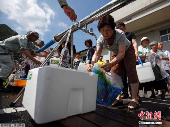 当地时间7月9日,日本广岛三原居民在被洪水淹没地区附近一个紧急供水站接水。