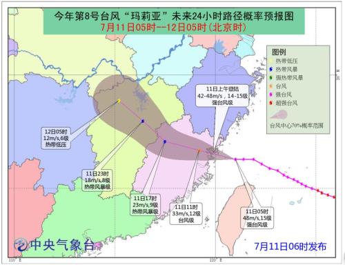 预计,“玛莉亚”将以每小时30公里左右的速度向西偏北方向移动,即将于11日上午在福建霞浦到福清一带沿海登陆(强台风级,14~15级,42~48米/秒)。登陆后向西北方向移动,强度逐渐减弱,穿过福建北部,于今天晚上移入江西境内,并减弱为热带低压。11日08时至12日08时,台湾岛北部、福建中北部、浙江南部、江西中南部等地将有大雨或暴雨,其中,福建北部、浙江东南部、江西中部等地的部分地区有大暴雨(100~240毫米),上述地区最大小时降水量30~50毫米,局地70毫米以上。中央气象台11日06时继续发布台风红色预警。