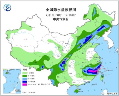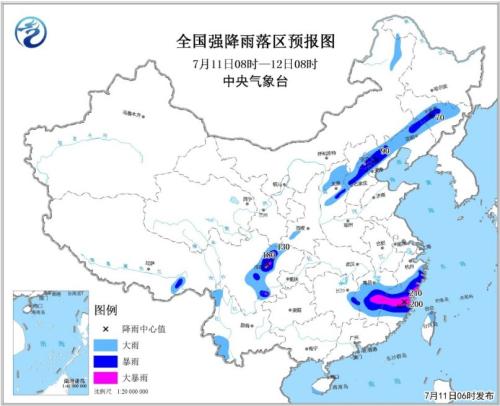 7月11日08时至12日08时,台湾岛北部、福建中北部、浙江南部、江西中南部、湖南东部、四川盆地西部、陕西西南部、山西中北部、河北中部、北京、天津北部、辽宁北部、吉林中部等地有大雨或暴雨,其中,福建北部、浙江东南部、江西中部、四川盆地西部等地的部分地区有大暴雨(100~240毫米),此外,云南西部、海南岛、内蒙古东北部等地有分散性大雨,局地有暴雨,上述局部地区将伴有短时强降水等强对流天气。