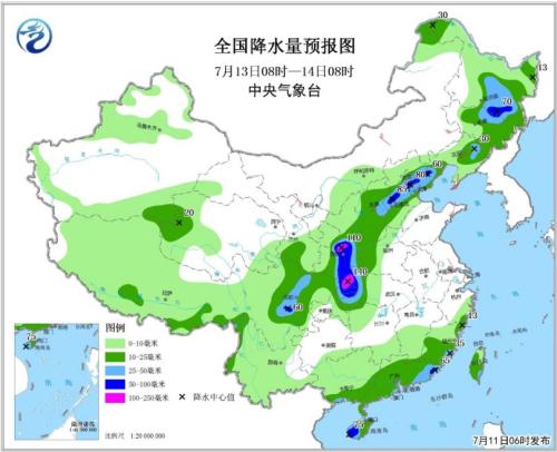 7月13日08时至14日08时,东北地区中部、华北中部、华南南部、四川盆地西部、陕西中南部、重庆北部、湖北西部等地有大雨或暴雨,其中,陕西中部和南部、重庆北部、湖北西部等地局地有大暴雨(100~140毫米);上述局部地区将伴有短时强降水等强对流天气。