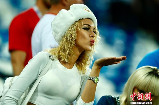 俄罗斯世界杯比赛看台上一位女球迷。中新社记者田博川摄