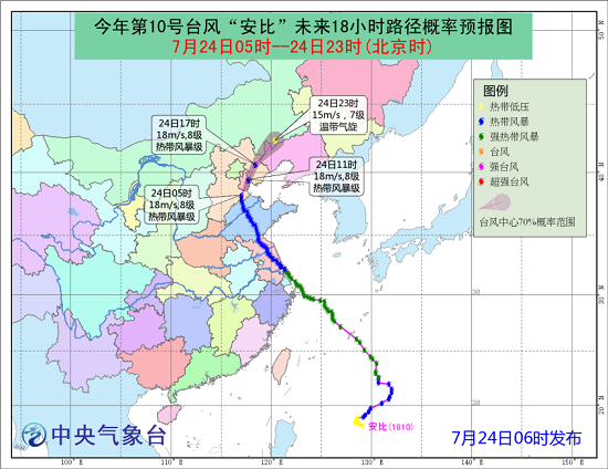 中央气象台7月24日06时继续发布台风蓝色预警:今年第10号台风“安比”(热带风暴级)的中心已于今天(24日)凌晨3点50分前后移入河北境内,早晨6点钟其中心位于河北省沧州市境内,就是北纬38.4度、东经117.0度,外围最大风力有8级(18米/秒),中心最低气压为990百帕。预计,“安比”将以每小时25公里左右的速度向北偏东方向移动,强度变化不大,即将于今天早晨7点钟前后移入天津境内(热带风暴级,8级,18米/秒),尔后逐渐转向东北方向移动,并将于24日夜间在内蒙古东南部地区变性为温带气旋。