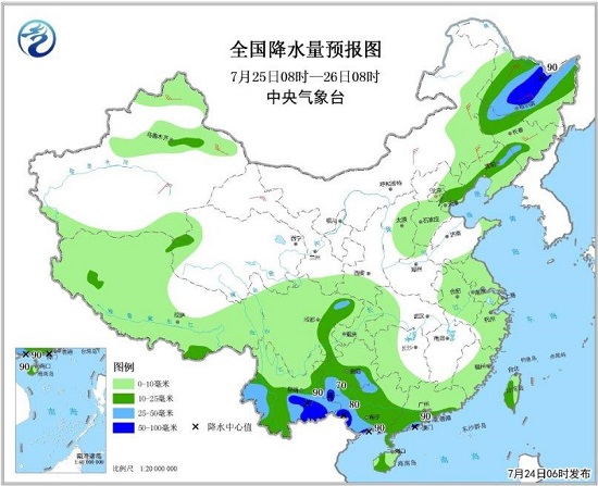 7月25日08时至26日08时,黑龙江大部、吉林西部和南部、辽宁中部、河北东部、华南南部和西部、贵州中南部、云南中南部等地有中到大雨,其中,黑龙江中部、广西西部、云南东南部的部分地区有暴雨(50~90毫米);上述部分地区将伴有短时强降水、雷暴大风等强对流天气。南海西南部海域将有5~6级、阵风7级的西南风。