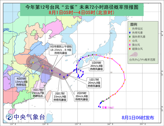今年第12号台风“云雀”将以每小时15-20公里的速度向西偏南方向移动,2日早晨开始逐渐转向西偏北方向,强度将有所加强,最强可达热带风暴级到强热带风暴级,并将于3日早晨到上午在浙江象山到江苏启东一带沿海登陆。登陆后继续向西偏北方向移动,强度逐渐减弱。中央气象台8月1日06时发布台风蓝色预警,预计8月1日08时至2日08时,东海北部和东海南部的偏北海域将有6-7级大风,“云雀”中心经过的附近海面风力有8级,阵风可达9-10级。
