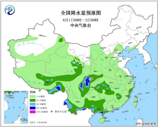 8月1日08时至2日08时,新疆东北部、西藏中东部、青海东部、四川盆地中西部、云南西部和南部、江汉南部、江南西部和南部、华南西部等地的部分地区有中到大雨,其中,四川盆地中西部、云南西部和东南部、广西南部沿海、广东西南部沿海等地局地有暴雨或大暴雨(100~150毫米);黄淮西部、江南东部等地的部分地区有分散性阵雨或雷阵雨;上述部分地区伴随短时强降水(最大小时降水量20~50毫米,局地60毫米以上),局地并伴有雷暴大风等强对流天气(见图4)。
