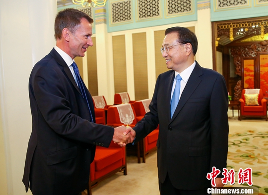 7月30日,中国国务院总理李克强在北京中南海紫光阁会见来华出席第九次中英战略对话的英国外交大臣亨特。中新社记者刘震摄