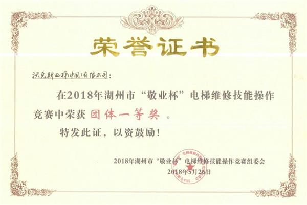 据悉,近期沃克斯电梯在2018年湖州市“敬业杯”电梯维修技能操作团体比赛中又得一金,再度续写了沃克斯电梯在各类电梯相关竞赛中的辉煌成绩。