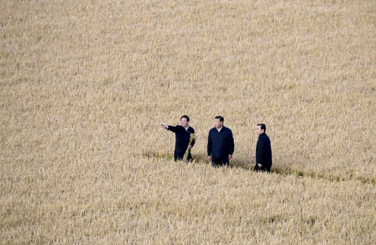 这次考察的第一站,是三江平原腹地的建三江。新华视点微博发了几张图片,有一张图片,他站在丰收的稻田中间,若有所思……
