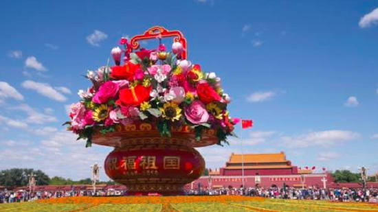 北京天安门广场国庆主题花篮“祝福祖国”。中新社记者贾天勇摄