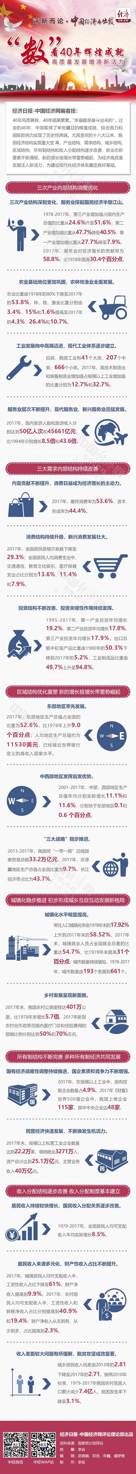 经济日报-中国经济网编者按:40年风雨兼程,40年硕果累累。“幸福都是奋斗出来的”。过去的40年,中国取得了举世瞩目的辉煌成就,综合国力和国际影响力实现了历史性跨越。尤其是党的十八大以来,我国经济结构实现重大变革,产业结构、需求结构、城乡结构、区域结构、所有制结构和收入分配结构逐步改善,新业态新要素不断涌现,新的增长极增长带蓄势崛起,为经济高质量发展注入新活力,为建设现代化经济体系奠定良好基础。