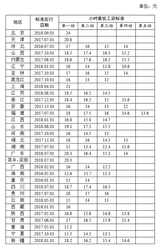 全国各地区小时最低工资标准情况(截至2018年9月),来源人社部官网