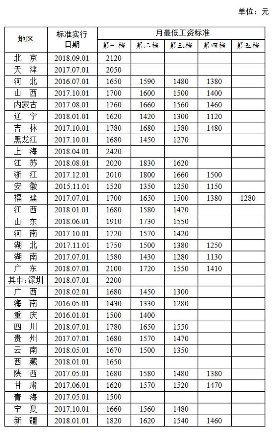 全国各地区月最低工资标准情况(截至2018年9月),来源人社部官网